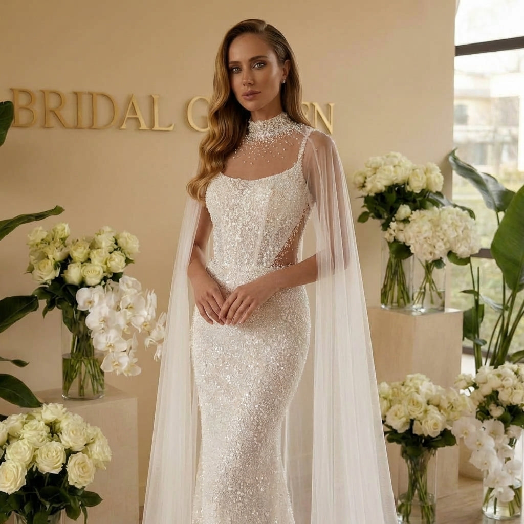 🌿 Robe de mariée sirène Lavine – Dentelle, perles & cape | Bridal Garden Paris...