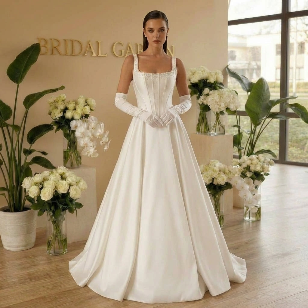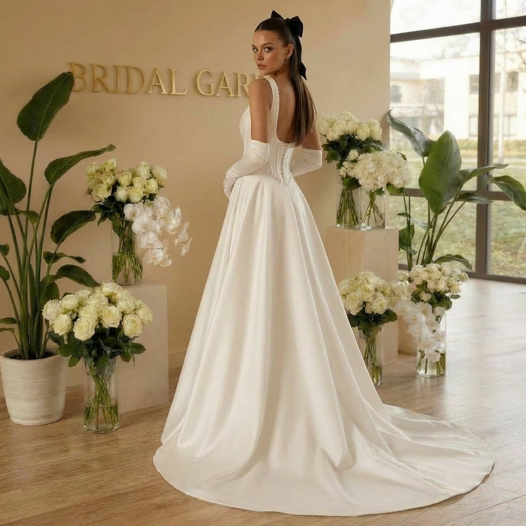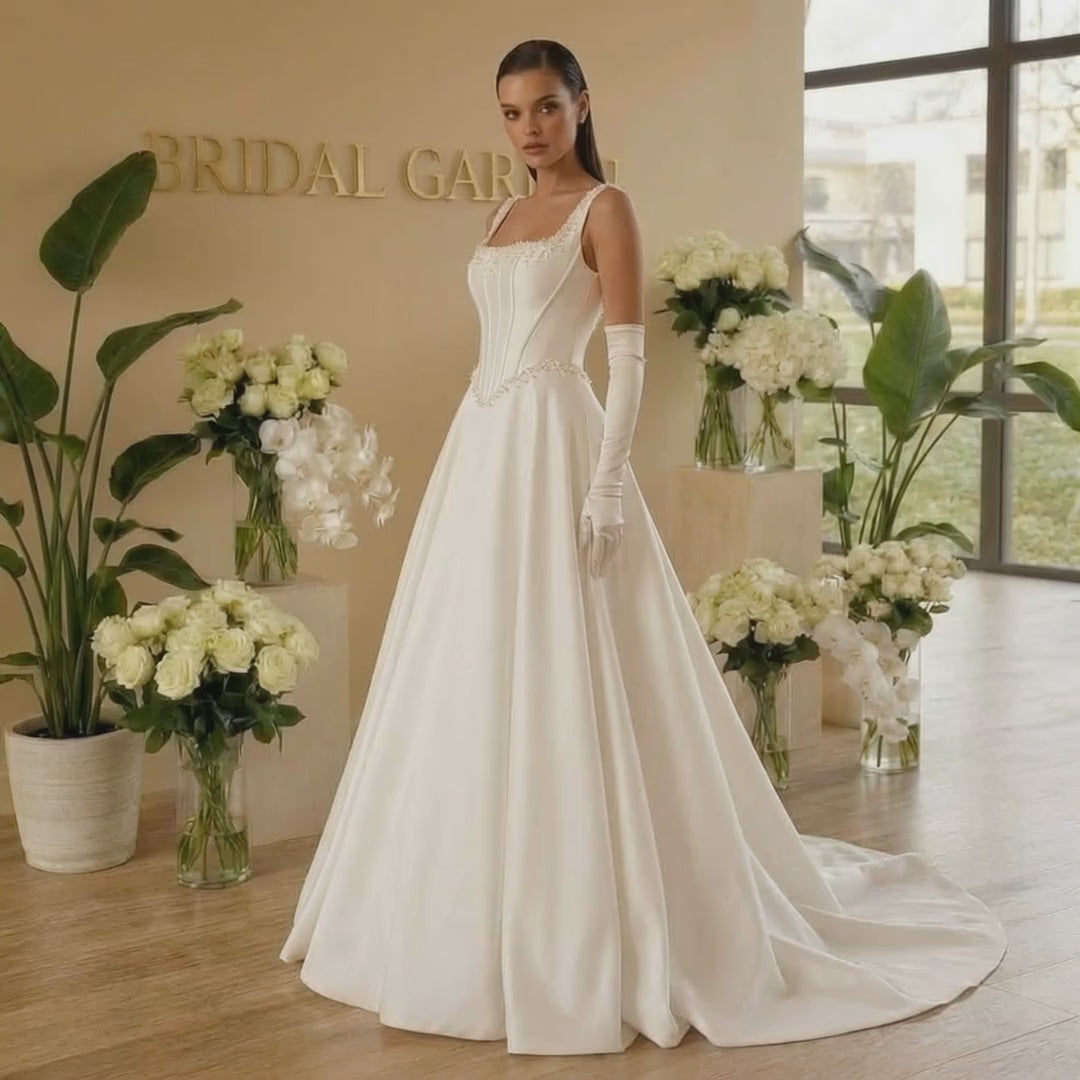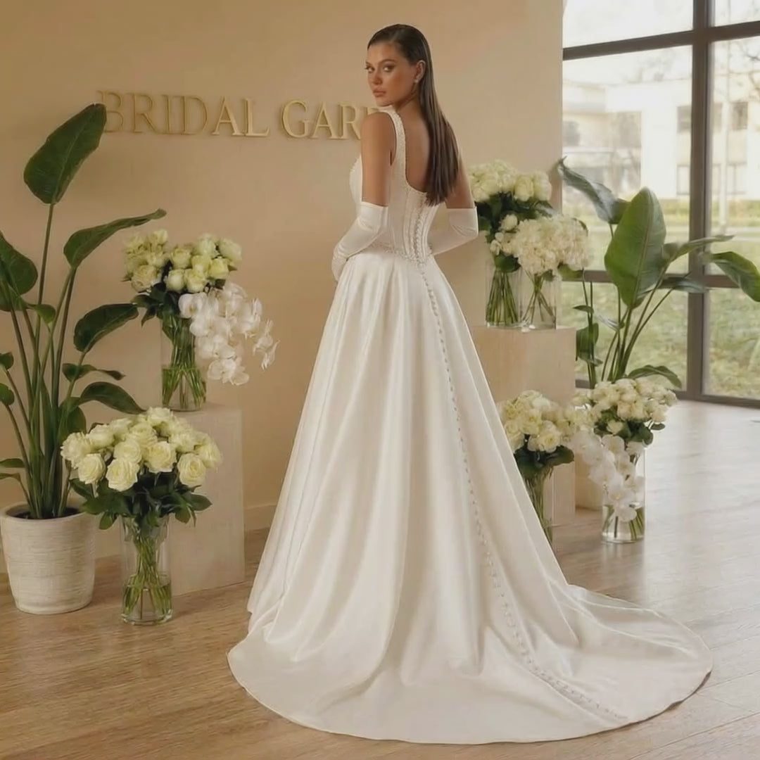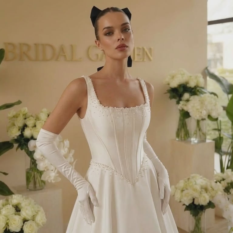 La robe de mariée Kalista incarne l’union parfaite entre romantisme et modernité. Sa coupe princesse sublime la silhouette avec un volume majestueux et un tombé fluide. Le corsage structuré à col carré met en valeur le port de tête, tandis que les fines bretelles et les délicates perles brodées soulignent la féminité du modèle. La taille ajustée se prolonge sur une somptueuse jupe fendue et une traîne cathédrale qui ajoute une dimension spectaculaire à l’ensemble. Élégante, raffinée et pleine de grâce, la robe Kalista est pensée pour la mariée romantique qui souhaite briller avec distinction et modernité.