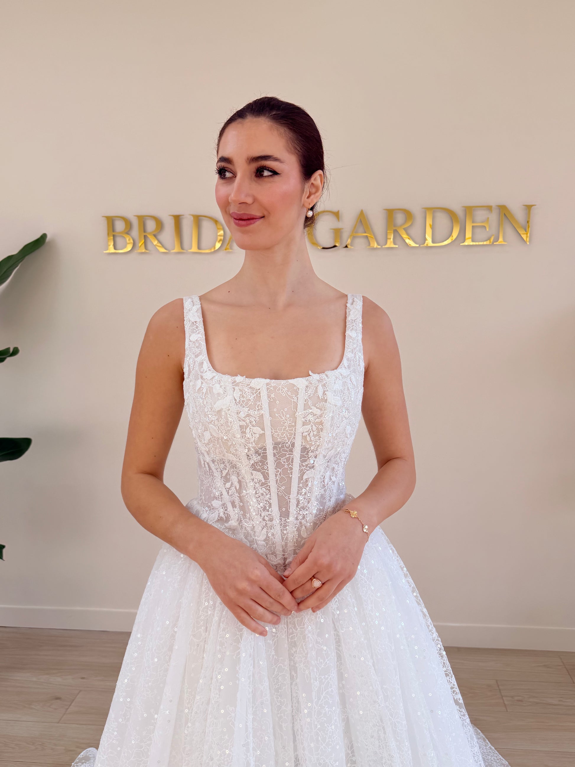 Son corset structuré, délicatement travaillé en dentelle perlée, sublime la silhouette en marquant la taille avec raffinement. Chaque détail scintillant capte la lumière avec subtilité, offrant un éclat sophistiqué sans excès.