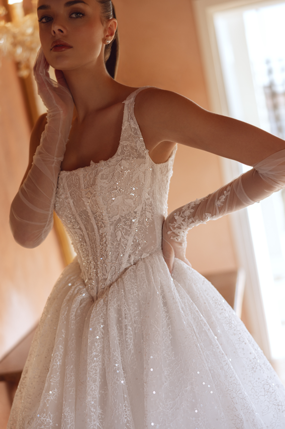 La jupe ample et aérienne, entièrement recouverte de dentelle fine et de légers sequins, apporte volume et majesté à chacun de vos pas. Les bretelles larges équilibrent parfaitement la tenue, tandis que les gants en tulle brodé ajoutent une note couture résolument chic et contemporaine.
