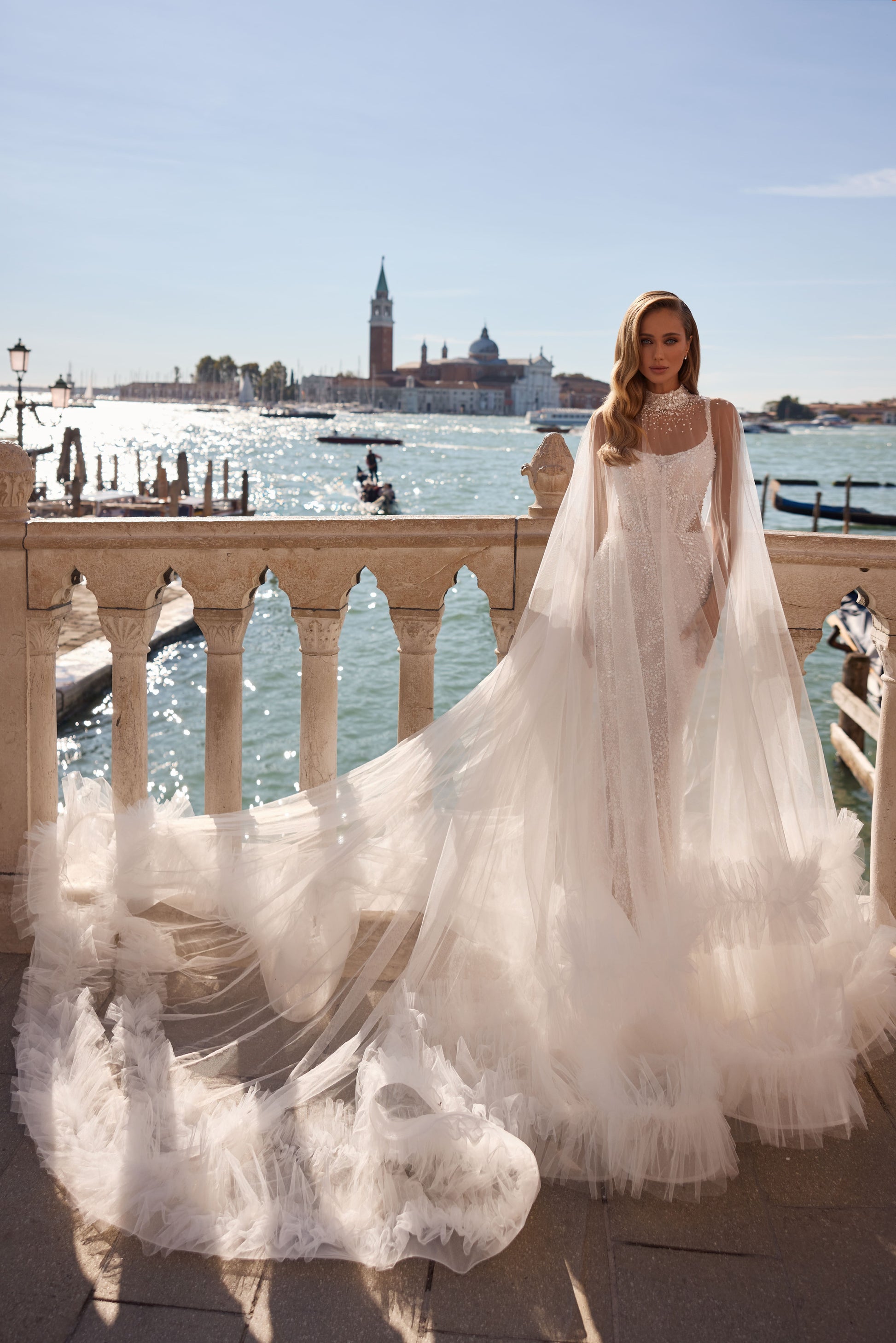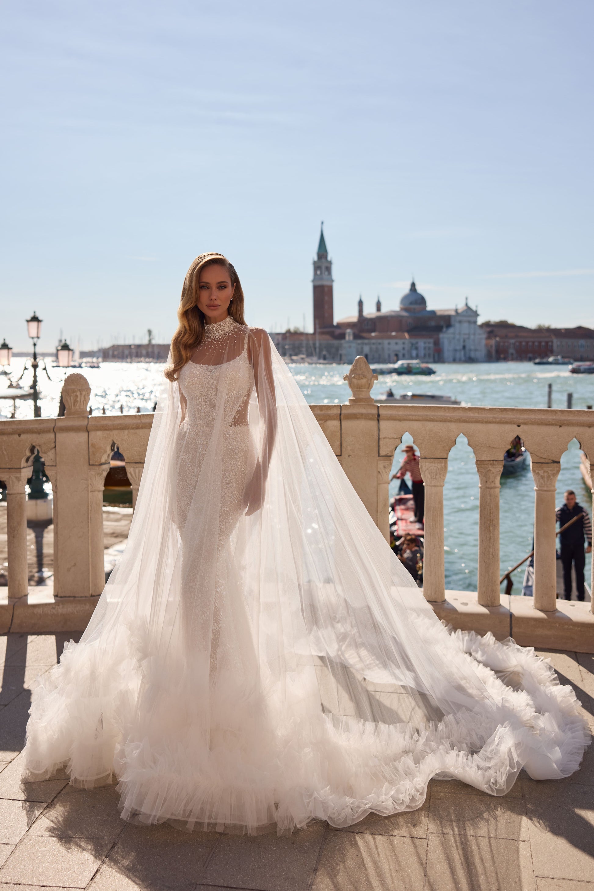 La cape amovible en tulle doux, ornée d’un ourlet texturé, crée un effet spectaculaire et fluide, parfait pour un moment d’exception.