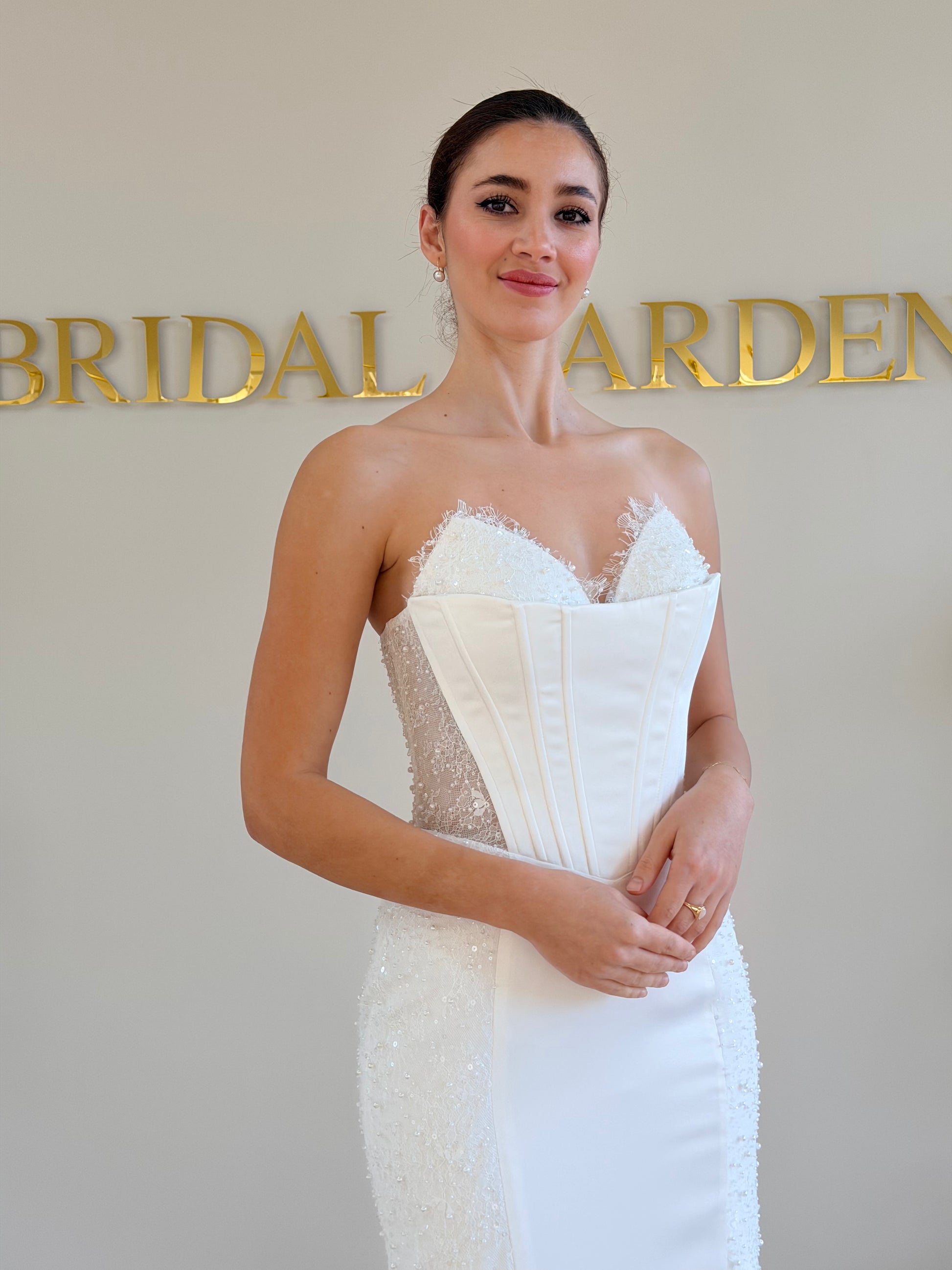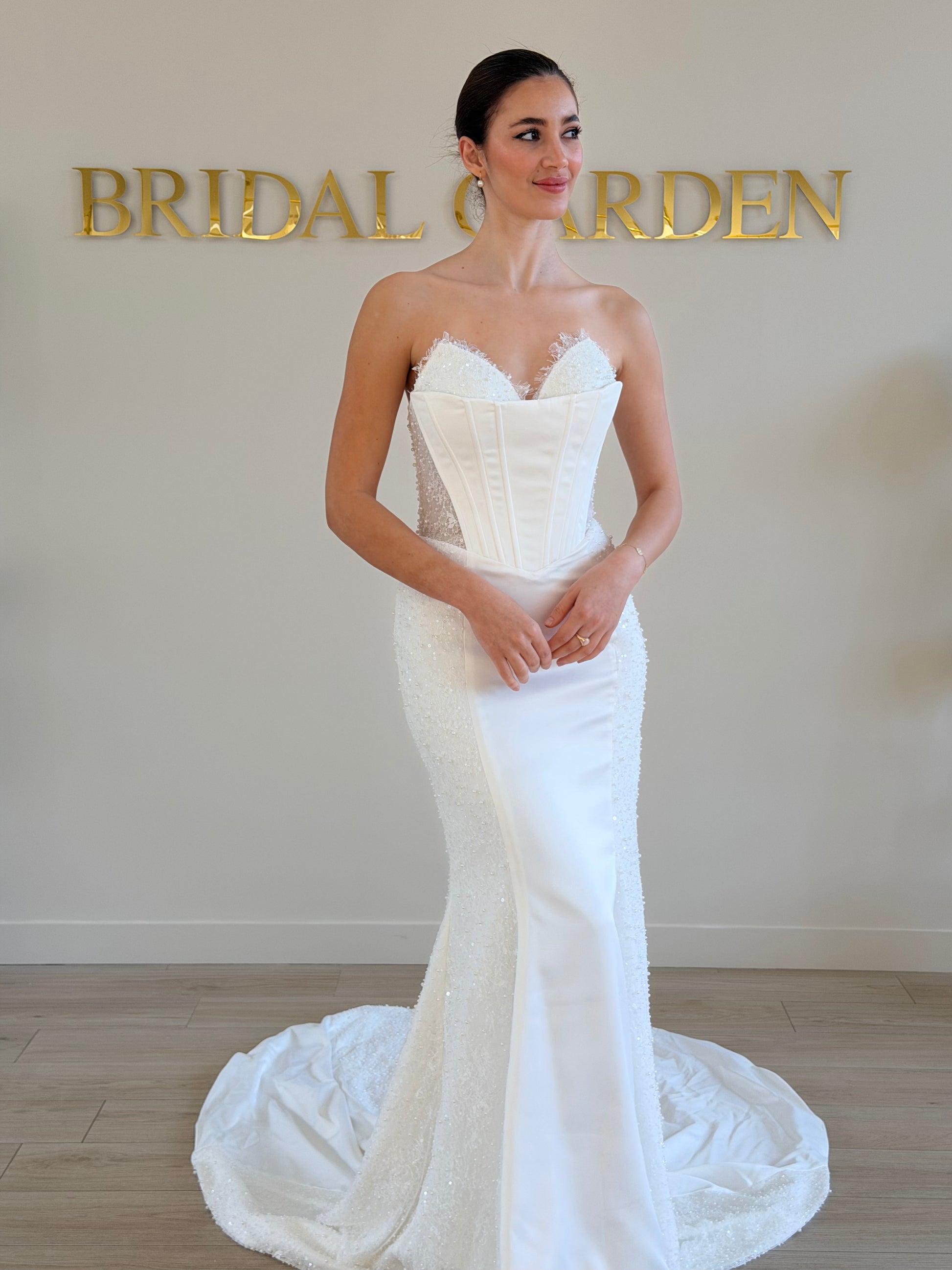 Cette robe de mariée incarne l’élégance sculpturale et le glamour moderne. Son corsage bustier esprit corset, sublimé par des empiècements latéraux en dentelle transparente et des bordures délicatement festonnées, dessine une silhouette parfaitement définie. Le jeu de transparences apporte une touche sensuelle tout en restant subtil et sophistiqué.