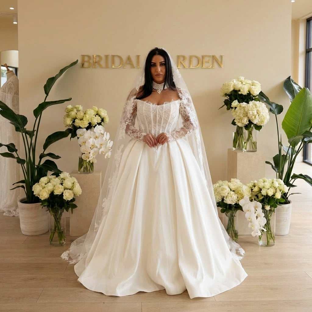 Dotée de manches longues en dentelle illusion et d’un décolleté carré sophistiqué, la robe Talia allie modernité et inspiration couture. Sa jupe ample et fluide, confectionnée dans un tissu noble et soyeux, apporte une touche majestueuse et offre un tombé impeccable, idéal pour une entrée remarquée le jour J.