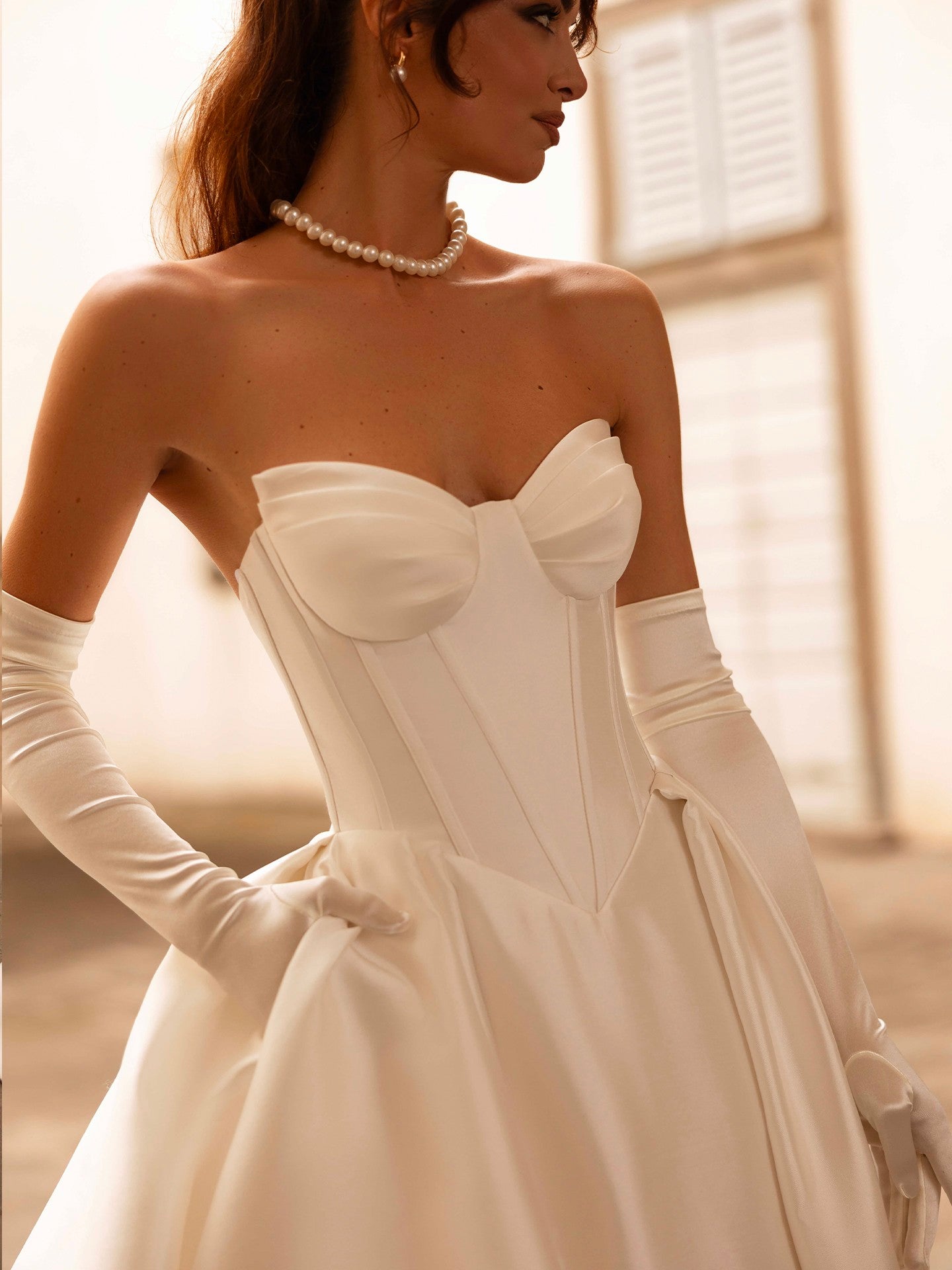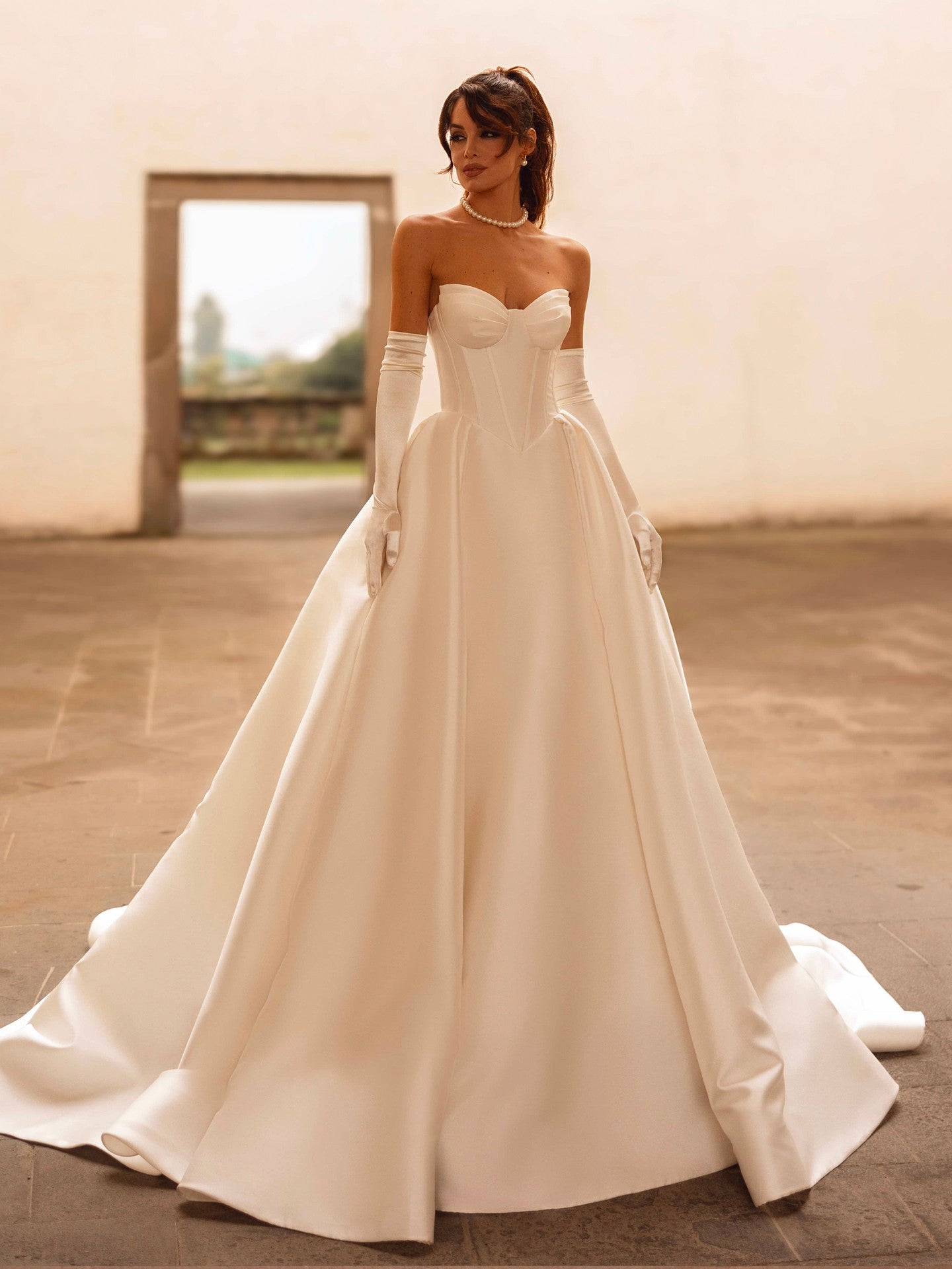 La robe de mariée Vivienne incarne la quintessence du romantisme et du raffinement. Sa somptueuse coupe princesse sublime la silhouette avec un volume majestueux et une présence royale. Le décolleté cœur met en valeur le buste avec douceur, tandis que le corsage ajusté souligne la taille pour une allure gracieuse et féminine. Confectionnée dans un tissu lumineux, la robe se déploie en une traîne cathédrale spectaculaire, parfaite pour un mariage de rêve. Élégante et intemporelle, Vivienne s’adresse à la mariée romantique qui souhaite briller avec noblesse et modernité.
